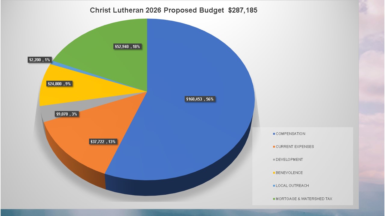 Current actual operating expenses Back to top The white paper below is offered to help you make a 21st century giving decision that you can challenge yourself each year as the Lord continues to by our Time , Talents, and Treasures as you participate as a CELC Team Member. A current paper from ELCA Resources Library on Giving and Tithing Back to top Time and Talent Needs next year Back to top EXCEL Proposed 2026 Budget for Christ Lutheran Heath. 2026 Budget Summary Table 2026 Budget Summary Pie Chart. Back to top